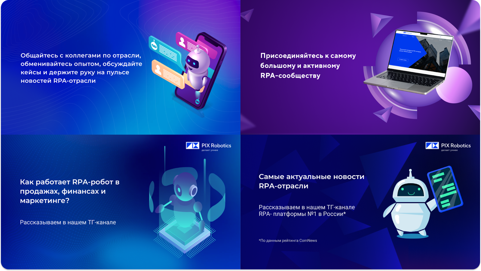 Сначала мы вели пользователей на сайт PIX и на группу в VK. Но со временем компания запустила канал и чат в Telegram. В первом PIX публикуют новости о роботизации и последних обновлениях продукта, а в чате развивает комьюнити людей, которые используют программных роботов в работе. Поэтому мы начали вести аудиторию в Telegram.